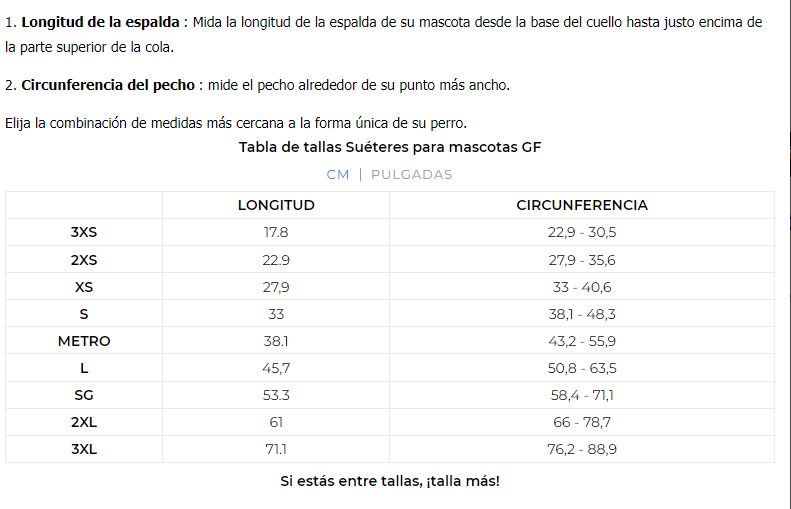 NOTA: Este estilo puede ser pequeño, así que considere aumentar la talla si su perro se encuentra en el extremo superior del rango de tallas.